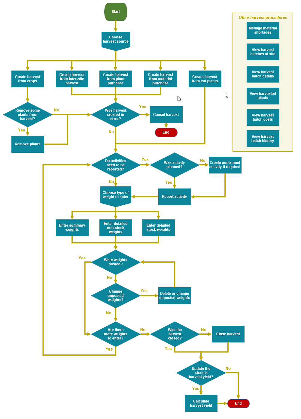 Flow for creating a harvest. In the actual document, each rectangle links to a procedure in the help.